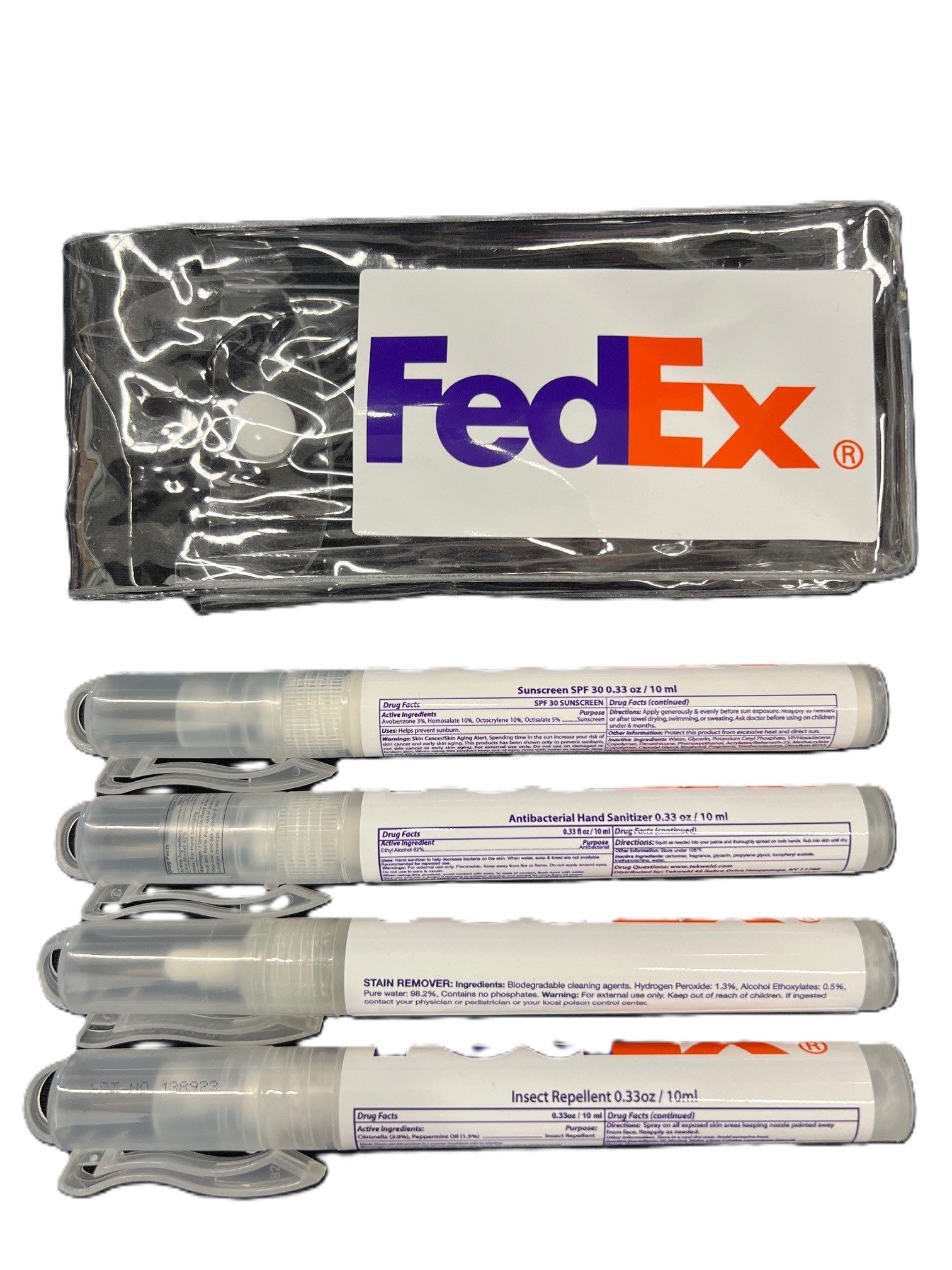 This handy travel kit includes 4 of the best travel essentials: antibacterial hand sanitizer, SPF 30 sunscreen, Deet Free insect repellent and a stain remover stick. Perfect for vacation travel or for the on the go business person.