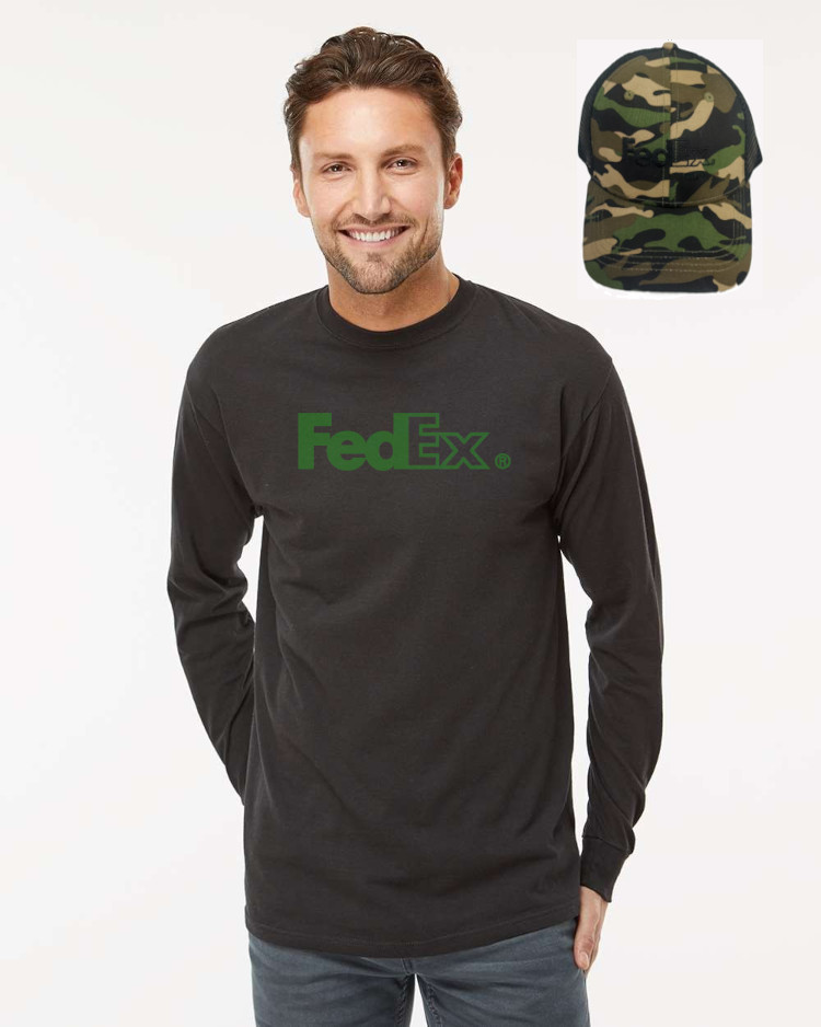 CAP: Camo tree/Black mesh snapback trucker cap with Fedex logo. LONG SLEEVE T-SHIRT: -5oz, 100% preshrunk cotton -Taped neck -Double-needle sleeve and bottom hem -Tear away label -USMCA Certified