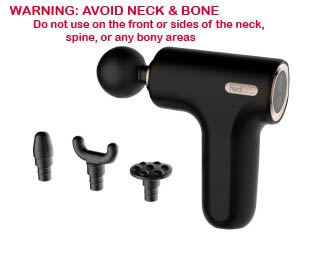 **WARNING: AVOID NECK & BONE. Do not use on the front or sides of the neck, spine, or any bony areas. ** This compact muscle massage gun delivers powerful relief with a brushed motor and four adjustable speed settings. Designed for portability, it features a comfortable grip with reliable performance. With USB-C charging compatibility and three interchangeable massage heads, it provides versatile options for targeting different muscle groups and easing soreness, stiffness, and tension.
