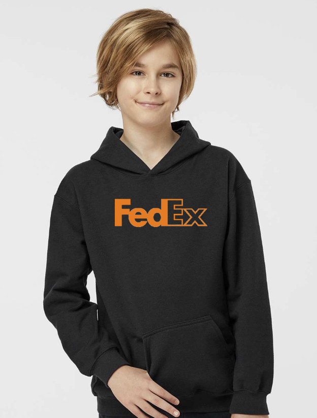 7.5 oz, 100% cotton face, Jersey lined hood, No drawcord, Pouch pocket, Ribbed cuffs and waistband with 5% spandex, Tear away label. FedEx Orange Glow Logo