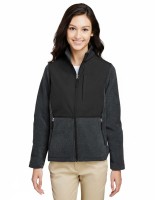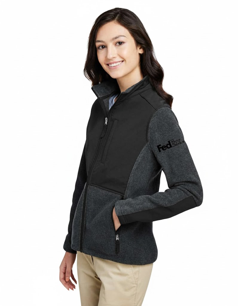 -Body: 7.5 oz. 100% polyester fleece -Contrast: nylon taslon overlay on upper panel and lower arms -Shock cord at bottom hem -Tear away label -Audio port