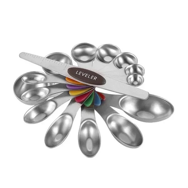 Key Features -2-in-1 pourer and sprayer - ideal for precise application of oils, dressings, and more. -Pump-action mechanism - delivers smooth, effortless spraying with each pump. -Compact and ergonomic design - easy to handle and fits conveniently in kitchen drawers or cabinets. -Glass base - durable and dishwasher safe for easy cleaning Versatile use - perfect for salads, cooking, baking, and more. 8-piece premium stainless steel measuring spoon set includes standard and metric measurements and a handy leveler tool for precise ingredient portions. The stackable magnetic design keeps the spoons together for easy storage. Each spoon features a smooth edge and comfortable grip, perfect for baking, cooking, meal prep, and kitchen organization. Ideal for branded giveaways, culinary promotions, or gourmet product lines. FDA food-grade safe, rust-resistant, and dishwasher safe.