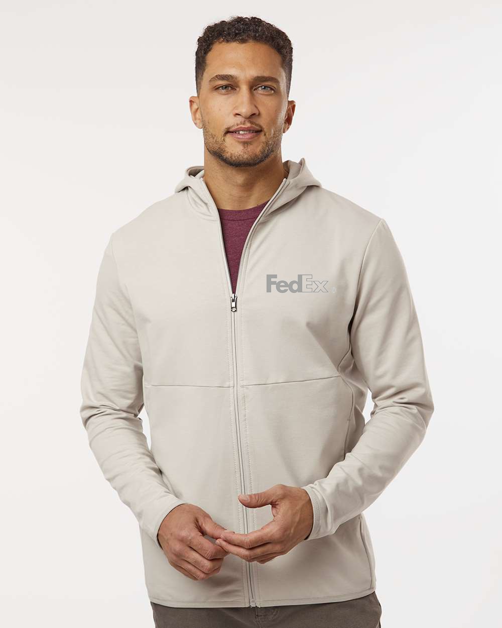 -8.5 oz. 60/35/5 cotton/polyester/spandex -Four-way stretch French Terry fabric for increased mobility Standard fit -100% ring-spun cotton face yarns for printability -Pre-laundered fabric to reduce shrinking -Reverse coil zipper -Double layer 3-panel hood -Hidden welt pockets -Tear away label