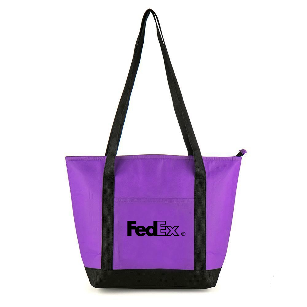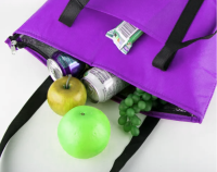 Portable 80 GSM non-woven polypropylene foil-lined cooler bag with black contrast double handles for comfort. Top zip access for easy access. 12 CAN CAPACITY