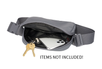 -Simple belt bag can be worn as a crossbody or a waist bag -Constructed of PVC-free material. Smooth matte Polyester fabric with knitted cloth, 210D/PU, and Polyester smooth webbing -Features main zippered compartment with interior key hook, an inside zipper pocket, and a slash pocket -Adjustable strap extends up to 46 inches