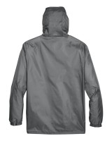 -1.77 oz, 100% polyester taffeta -Water-resistant finish -Rollaway adjustable hood -Elasticized cuffs -Center front coil zipper with auto-lock slider -Lower front concealed zippered pockets -Adjustable shock-cord at hem