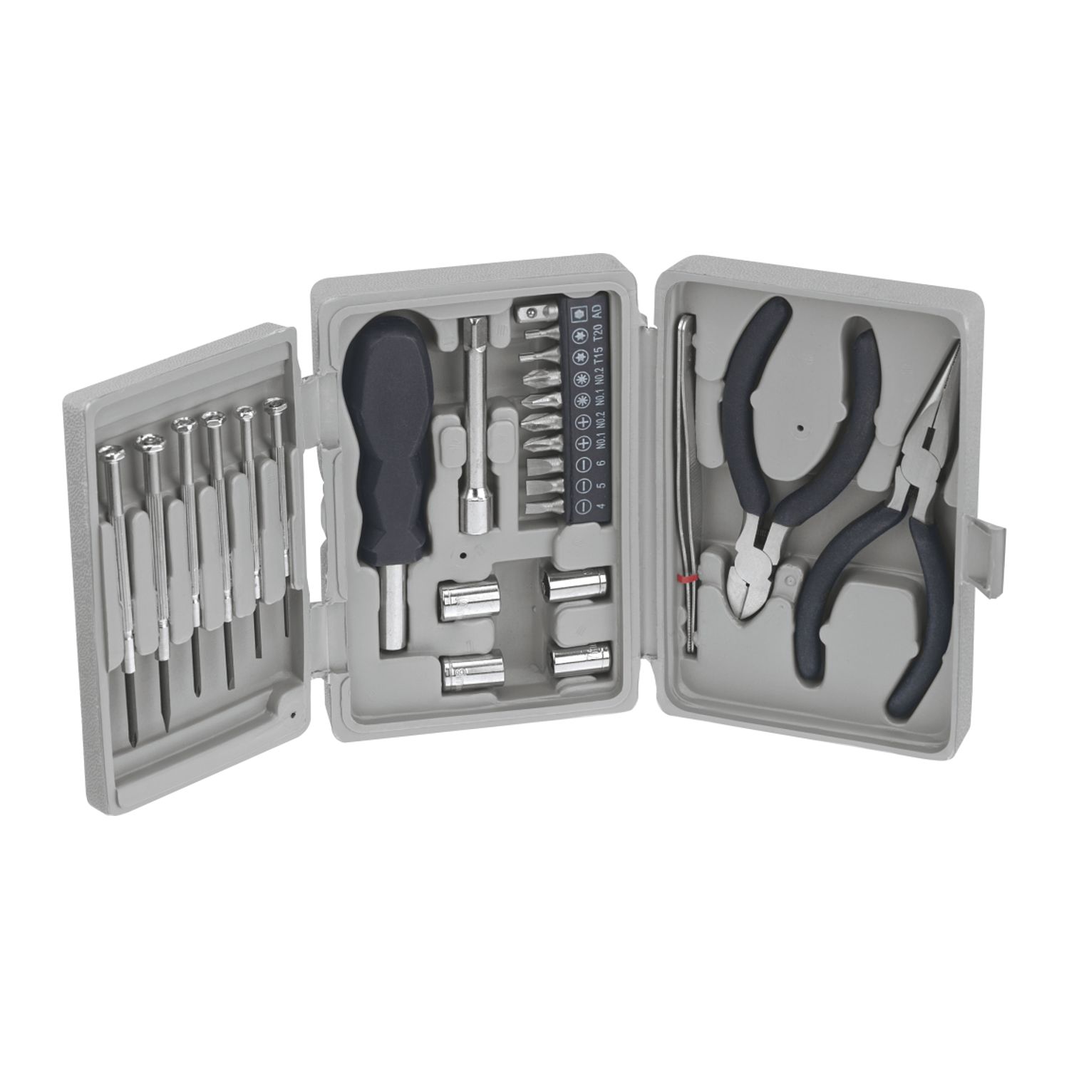 25-Piece Deluxe Carbon Steel Tool Kit that features include: 6 Mini Screwdrivers, Full-size Screwdriver with extension rod and 4-Sockets, 9 different tips, Needle-nose Pliers, Diagonal Wire Cutter plus a Full-size Tweezers all contained in a Custom Molded Plastic Carry/Storage Case.